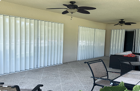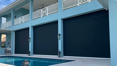 Motorized or manual roll screens that add shade, comfort and storm- rated protection for pations and openings